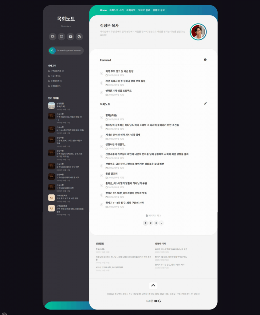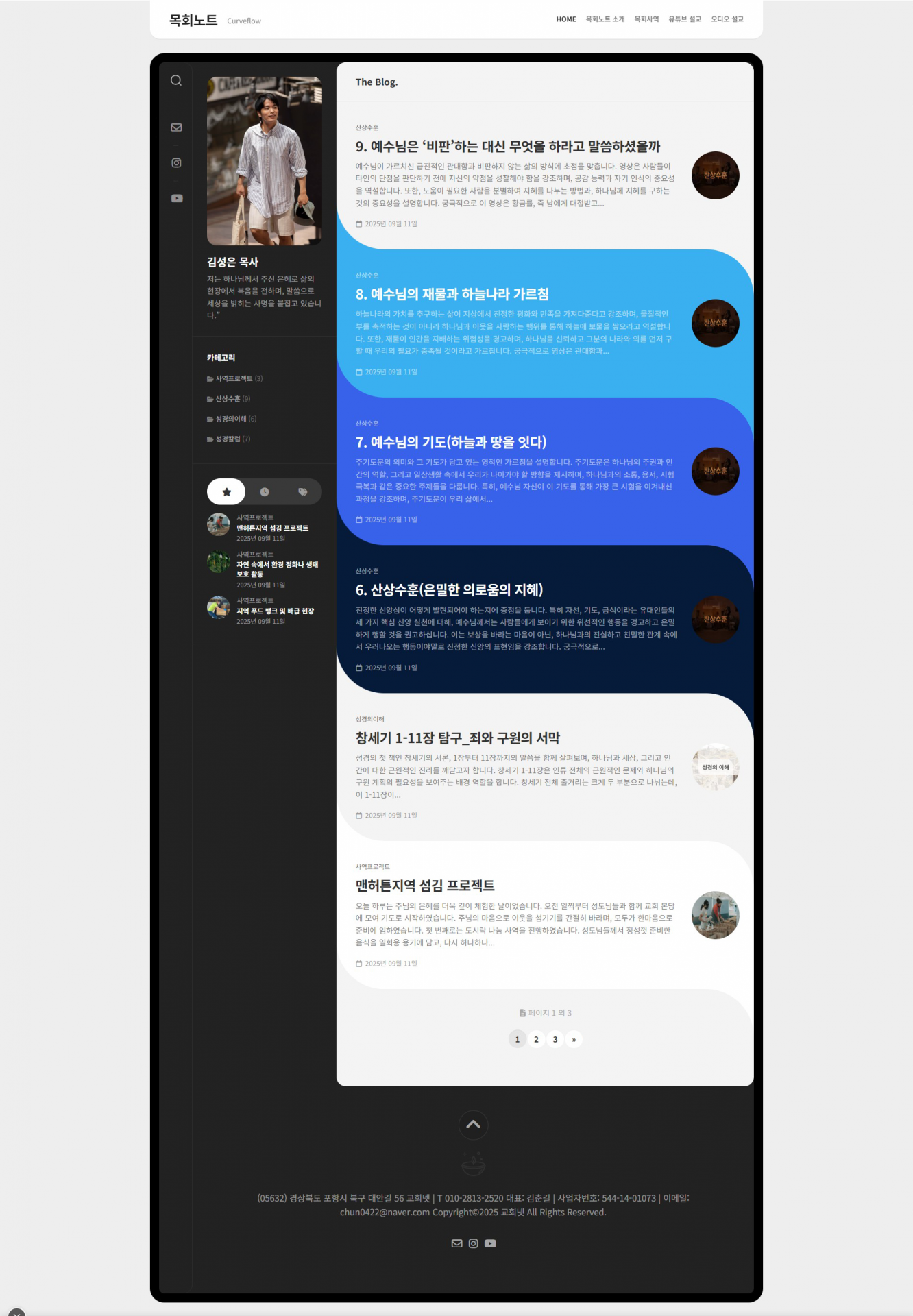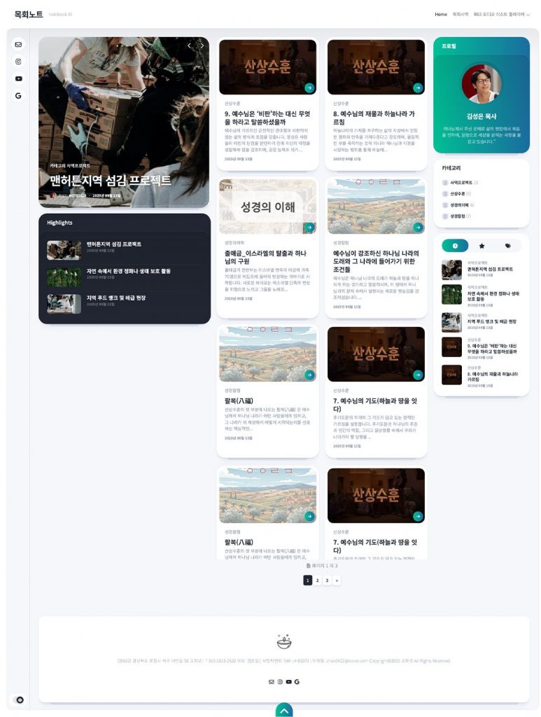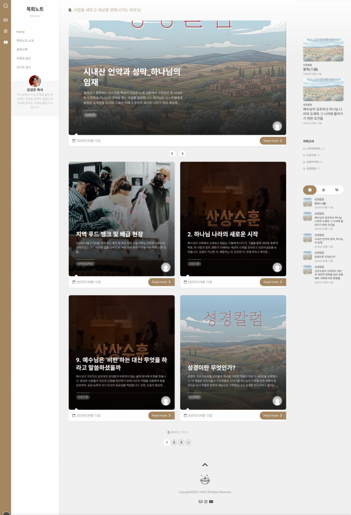 - 카테고리 분류(예: 산상수훈, 성경칼럼, 사역프로젝트)가 화면상 눈에 띄어 사용자에게 “어떤 주제의 글인가”를 직관적으로 전달합니다.